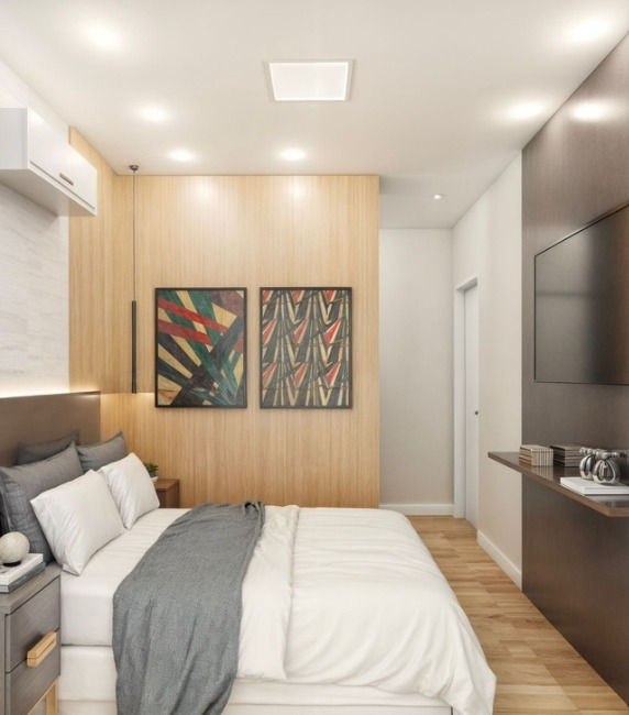 No interior, o projeto apresenta uma paleta suave composta por tons de madeira clara, cinza e branco, criando uma atmosfera leve e convidativa. O layout valoriza a fluidez entre dormitório, estar e copa, promovendo conforto visual e amplitude. A marcenaria planejada — presente no painel amadeirado, no armário espelhado e na compacta cozinha integrada — traz organização e sofisticação, além de